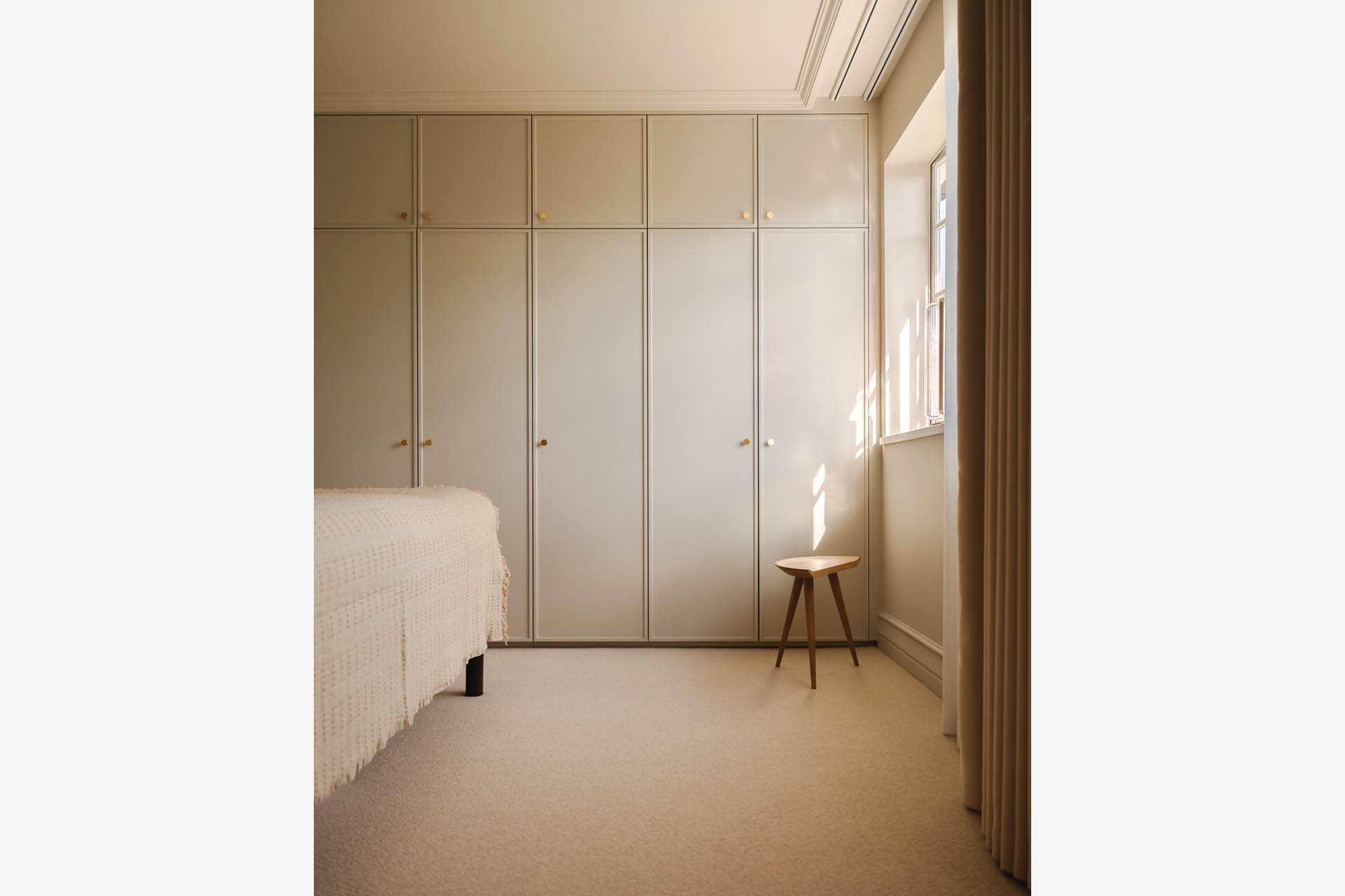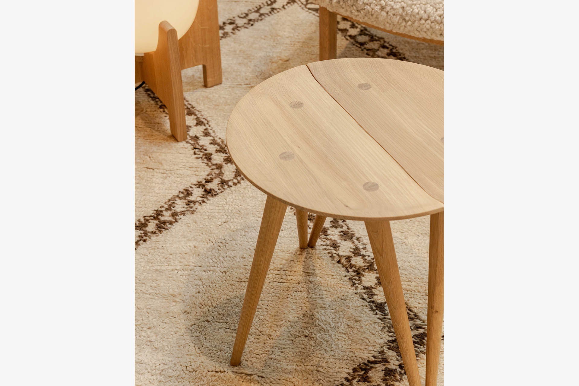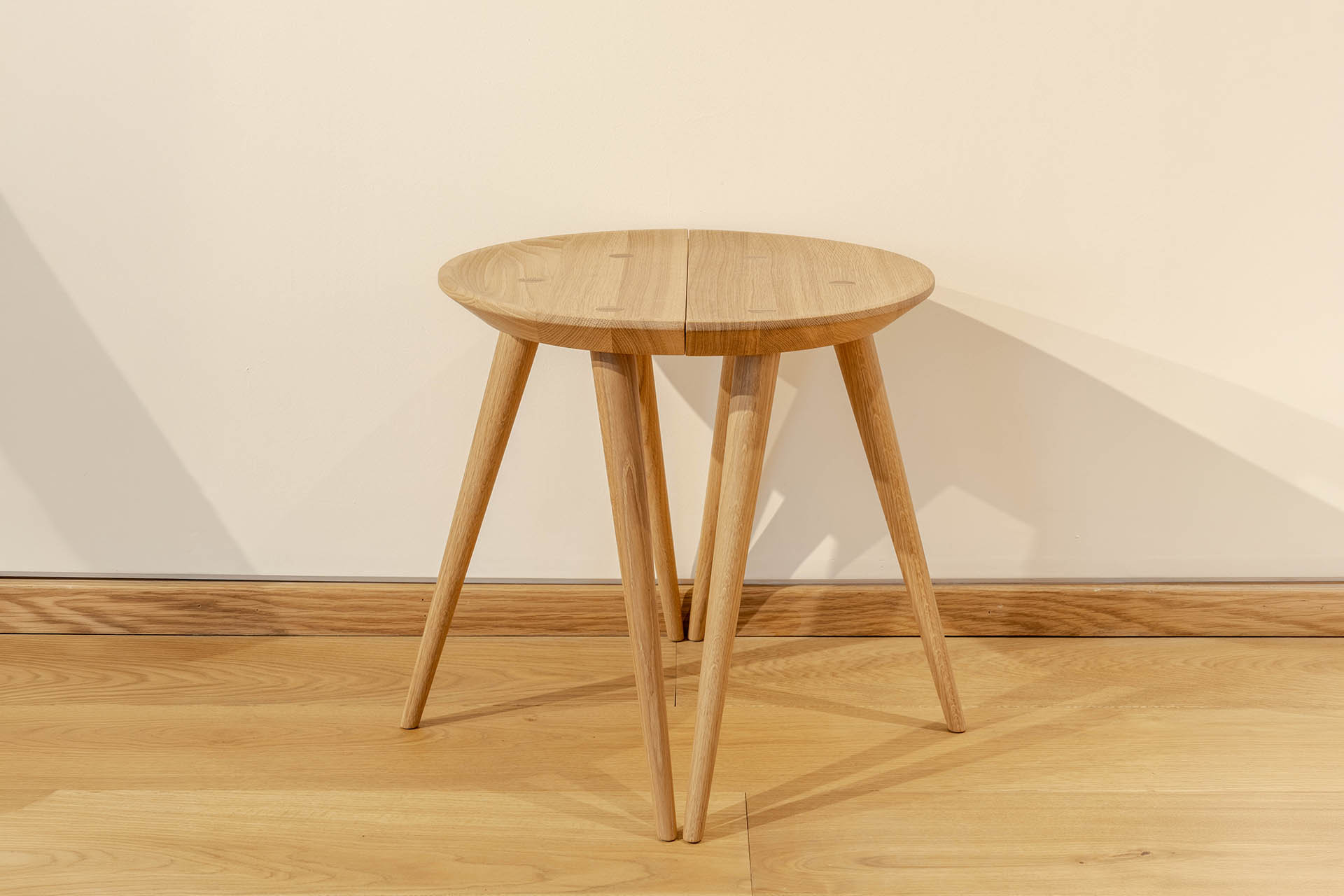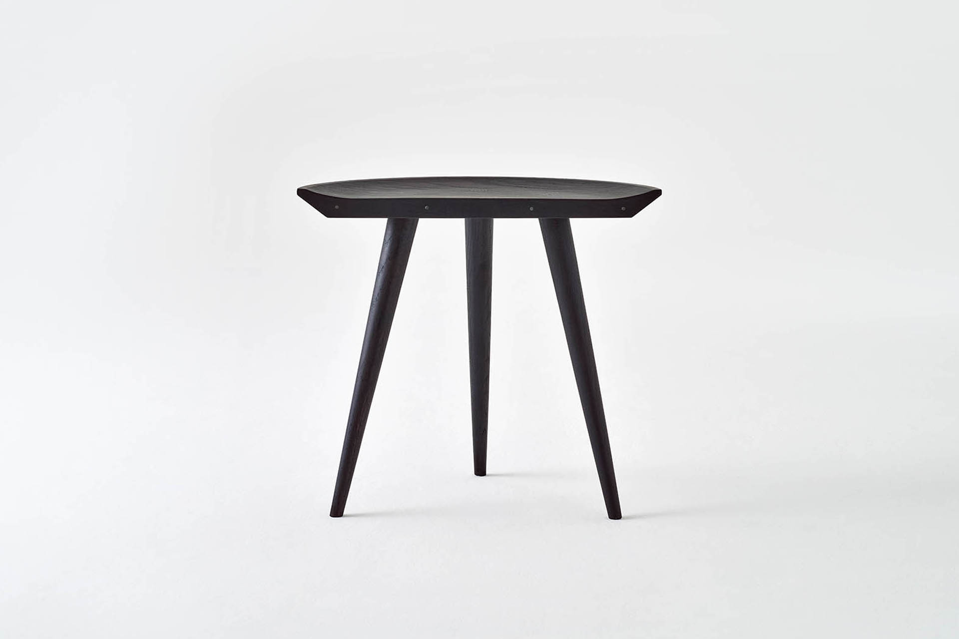 The three-legged Central Stool was originally designed by de Shalit during the 1950s as a student at London’s Central School of Arts and Crafts. The smooth, half-moon, turned wooden form features three tapered legs and crafted mortise and tenon joints. The piece works either as an occasional table or a stool; its straight side can align with the wall, or if paired with another stool, it forms a fully circular side table. The stool can also remain freestanding.